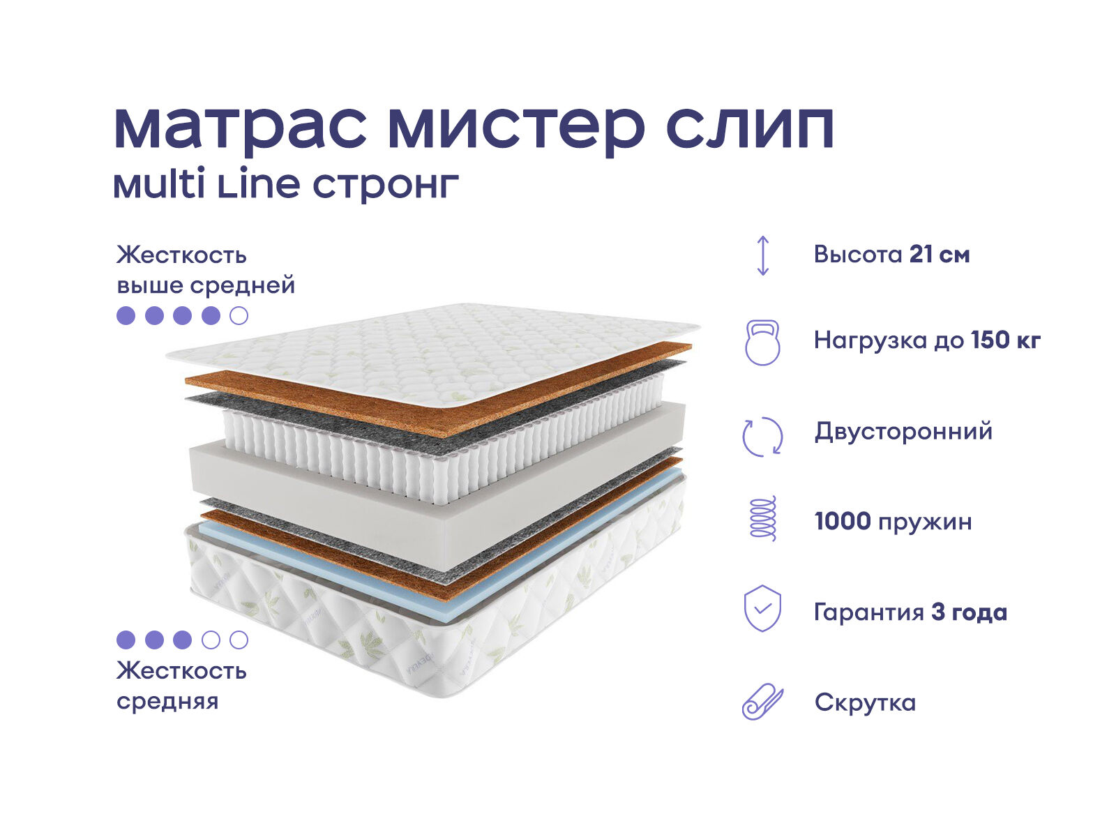 Практичный ортопедический матрас с двумя уровнями жёсткости и усиленной поддержкой. Модель создана для комфортного сна с учётом анатомии тела. Усиленный пружинный блок с 1000 независимых пружин на спальное место и натуральные наполнители обеспечивают надёжную поддержку и долговечность, выдерживая до 150 кг на спальное место.