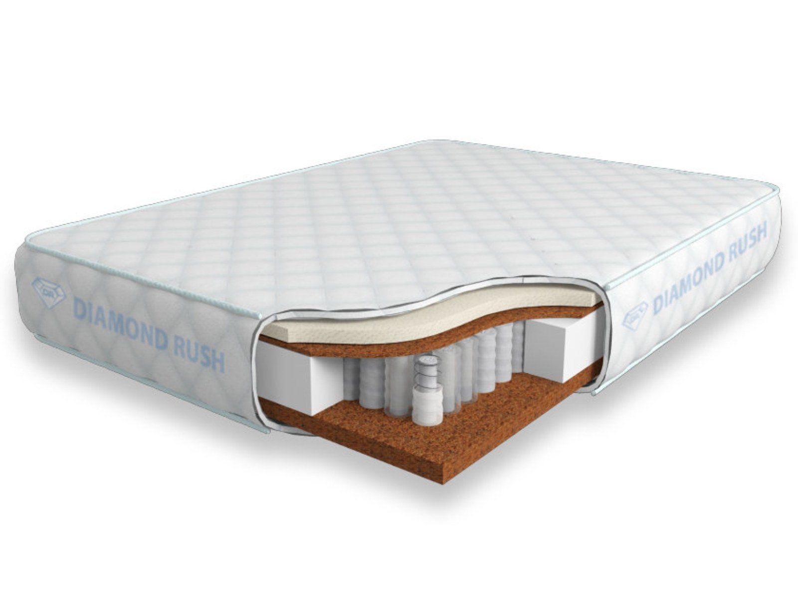 Матрас Diamond Rush Mix Cocos DP LD имеет в своей основе независимый пружинный блок DP, состоящий из сдвоенных пружин диаметром 3-4 и 5-6 см. В качестве настилочных слоев поверх пружинного блока используются износостойкий искусственный латекс, а также латексированная кокосовая койра. Матрас относится к разносторонним, так как с одной стороны имеет среднюю жесткость, а с другой является жестким.