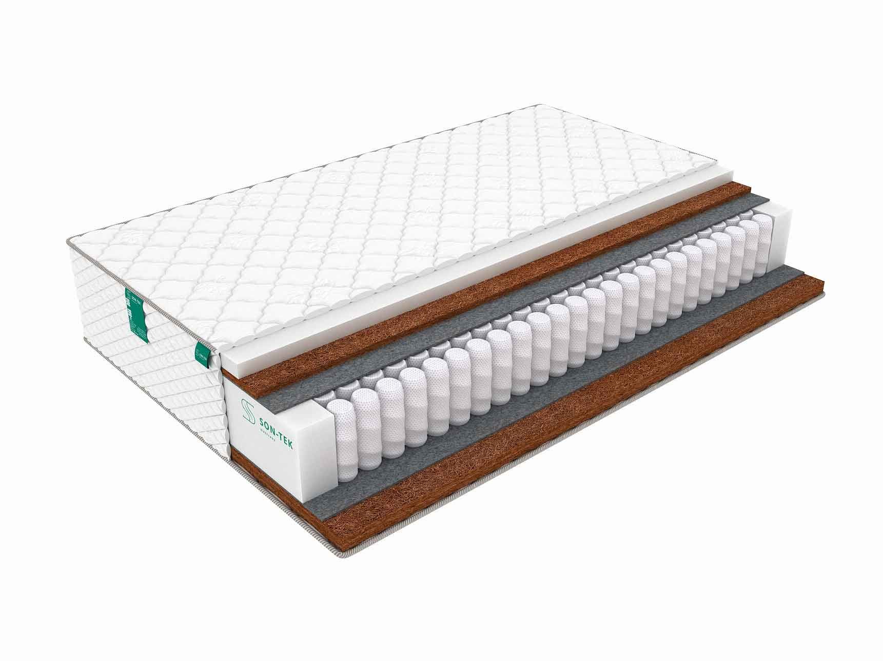 Блок пружин отделен от наполнителей слоями термовойлока,он защищает наполнители от контакта с пружинами и продлевает срок службы матраса.