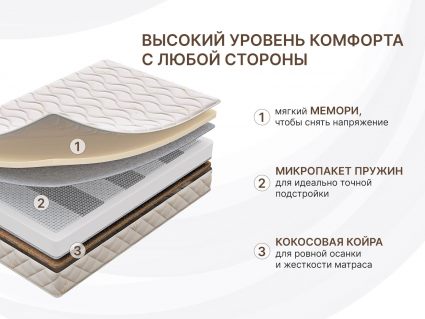 Пружинный матрас с эффектом памяти Микро Мемо Хард. Модель имеет две различные по жёсткости поверхности: жесткую и мягкую. Если вы предпочитаете максимальный комфорт и уютное спальное место, то вам подойдёт мягкая адаптивная сторона с пеной Мемори, а если вы любите высокую жёсткость, то поверхность с койрой кокоса станет наиболее оптимальным выбором.