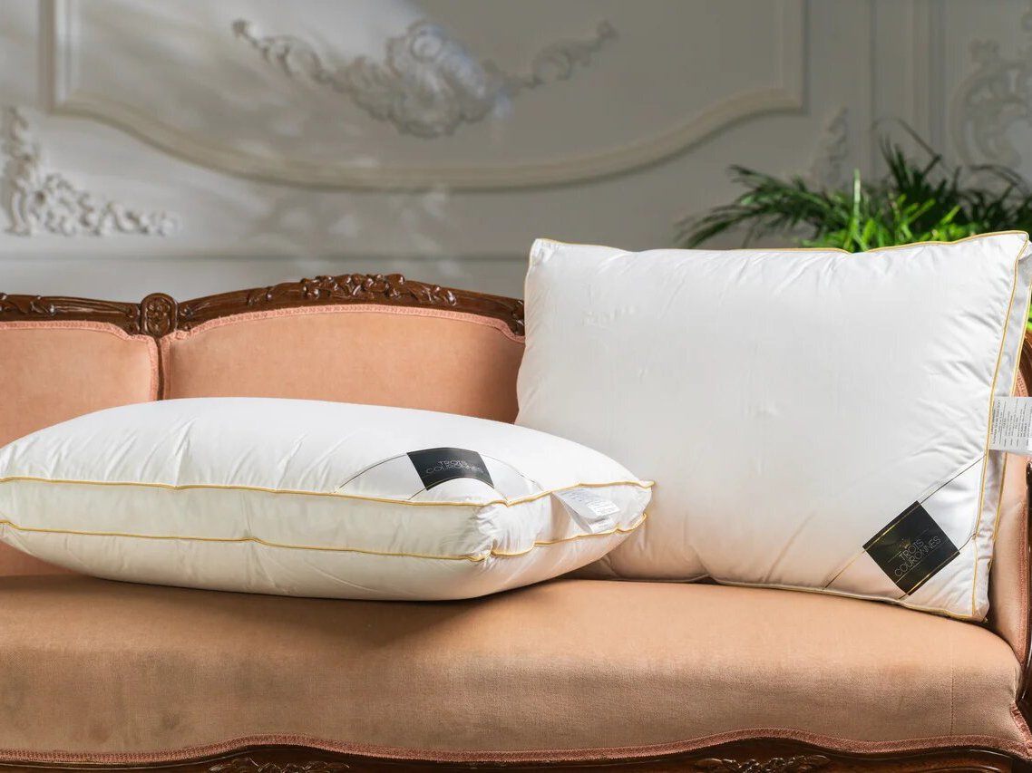Ортопедическая трехкамерная подушка c бортиком Luxury Selection 3-chamber Goose Down FIRM белого цвета c золотым кантом.