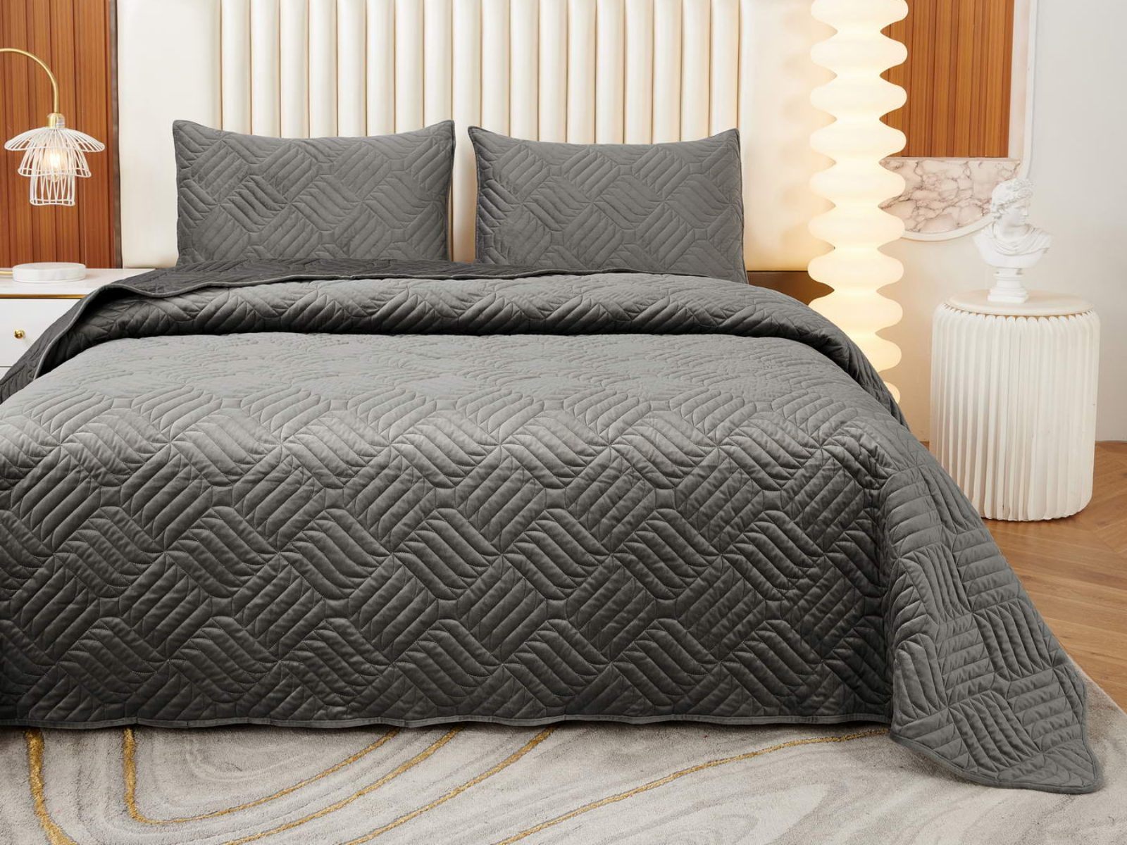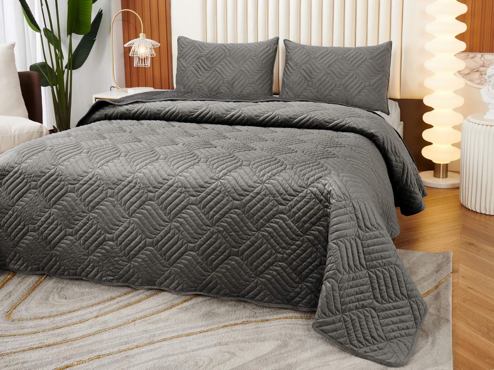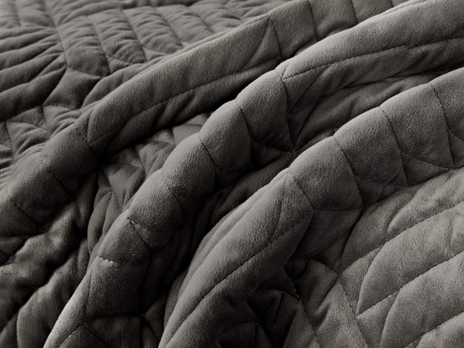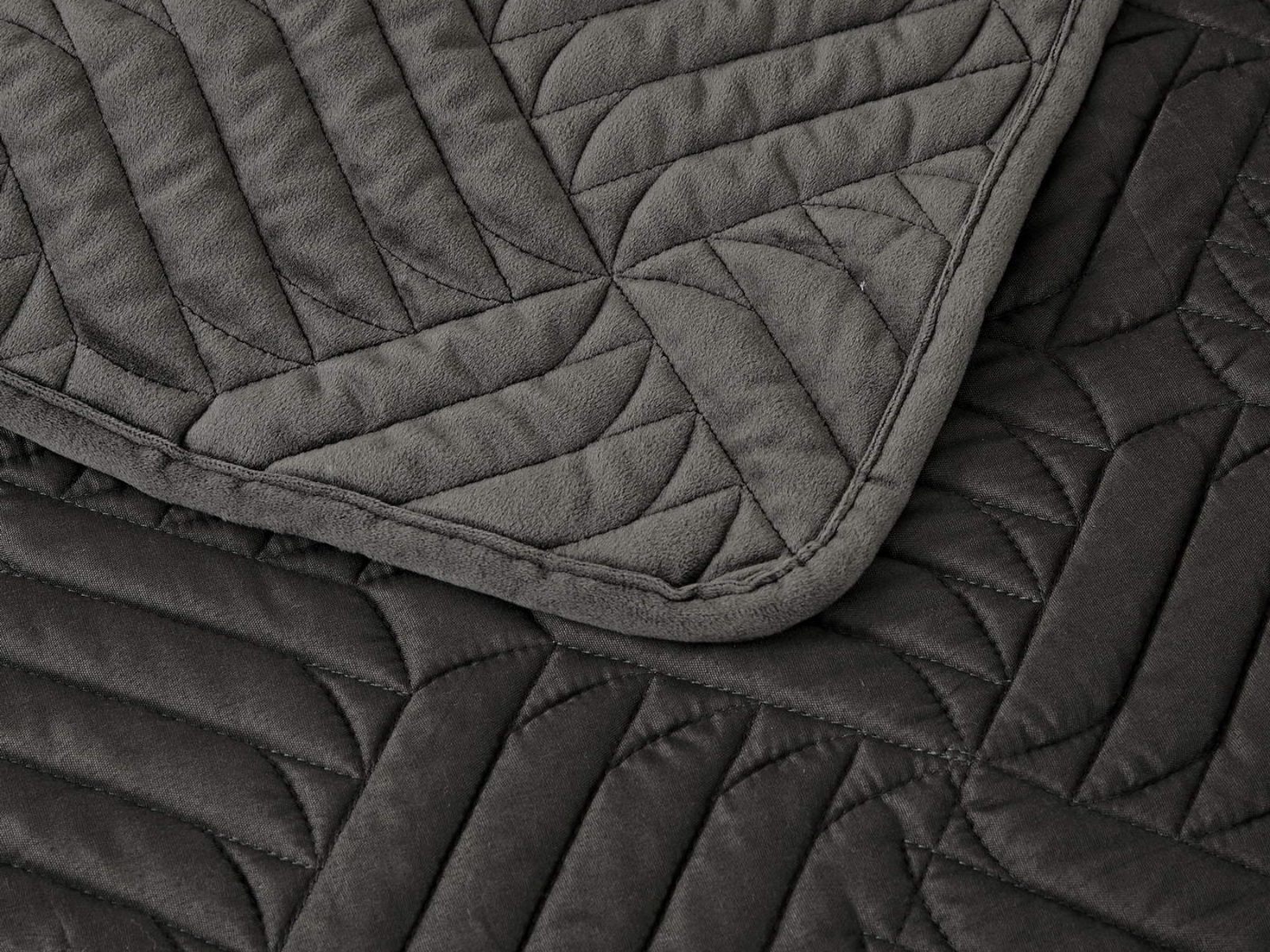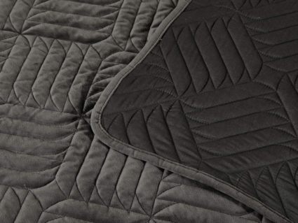 Покрывала выполнены в 10 оттенках: крем, мокко, пепельный, песочный, светло-бежевый, светло-серый, серый, темно-серый, чайная роза и черный. Стежка в виде геометрического орнамента подойдет к любому современному интерьеру. Из-за особого плетения, велюровая ткань покрывала отражает свет и красиво переливается при различном освещении.