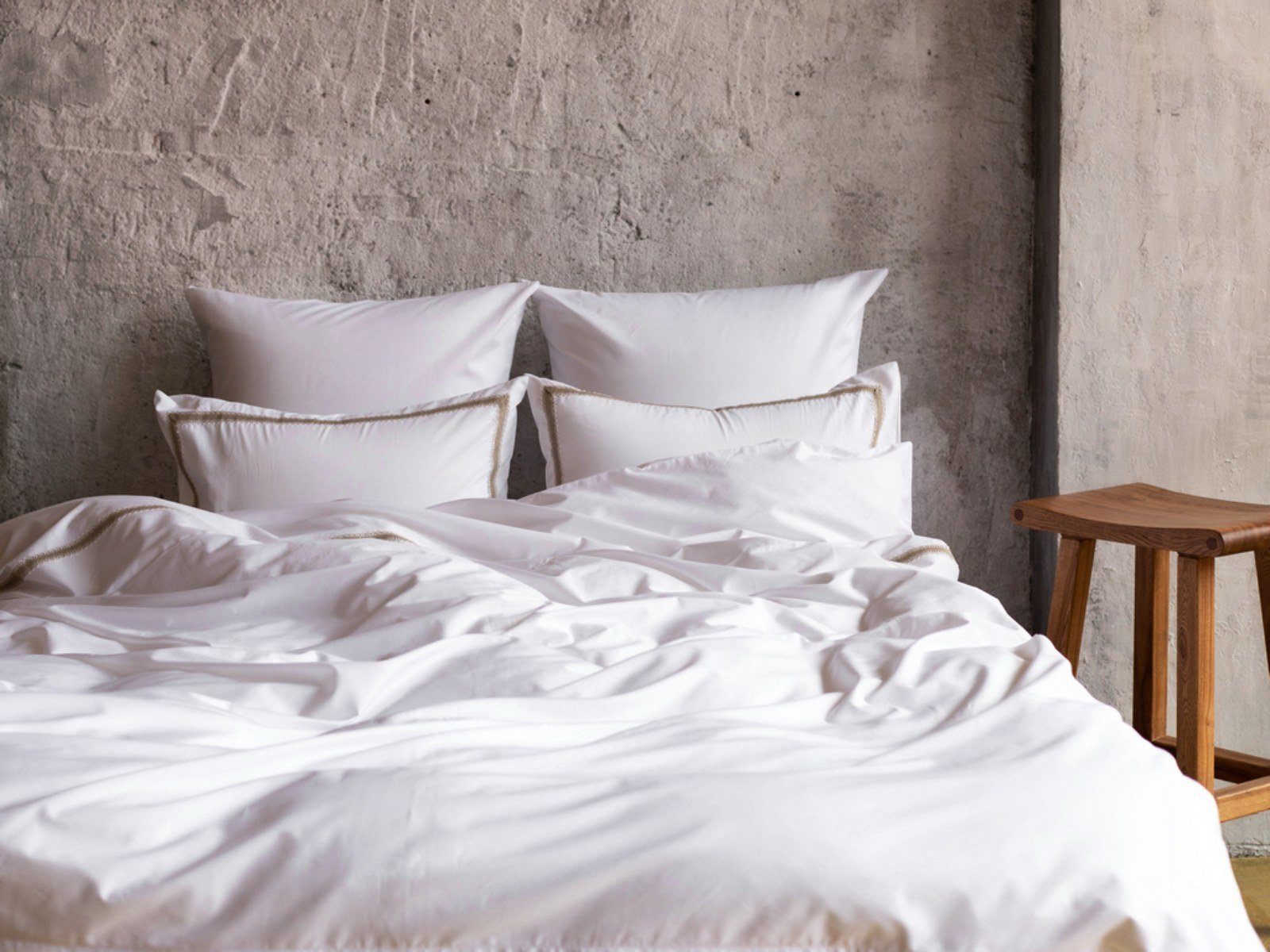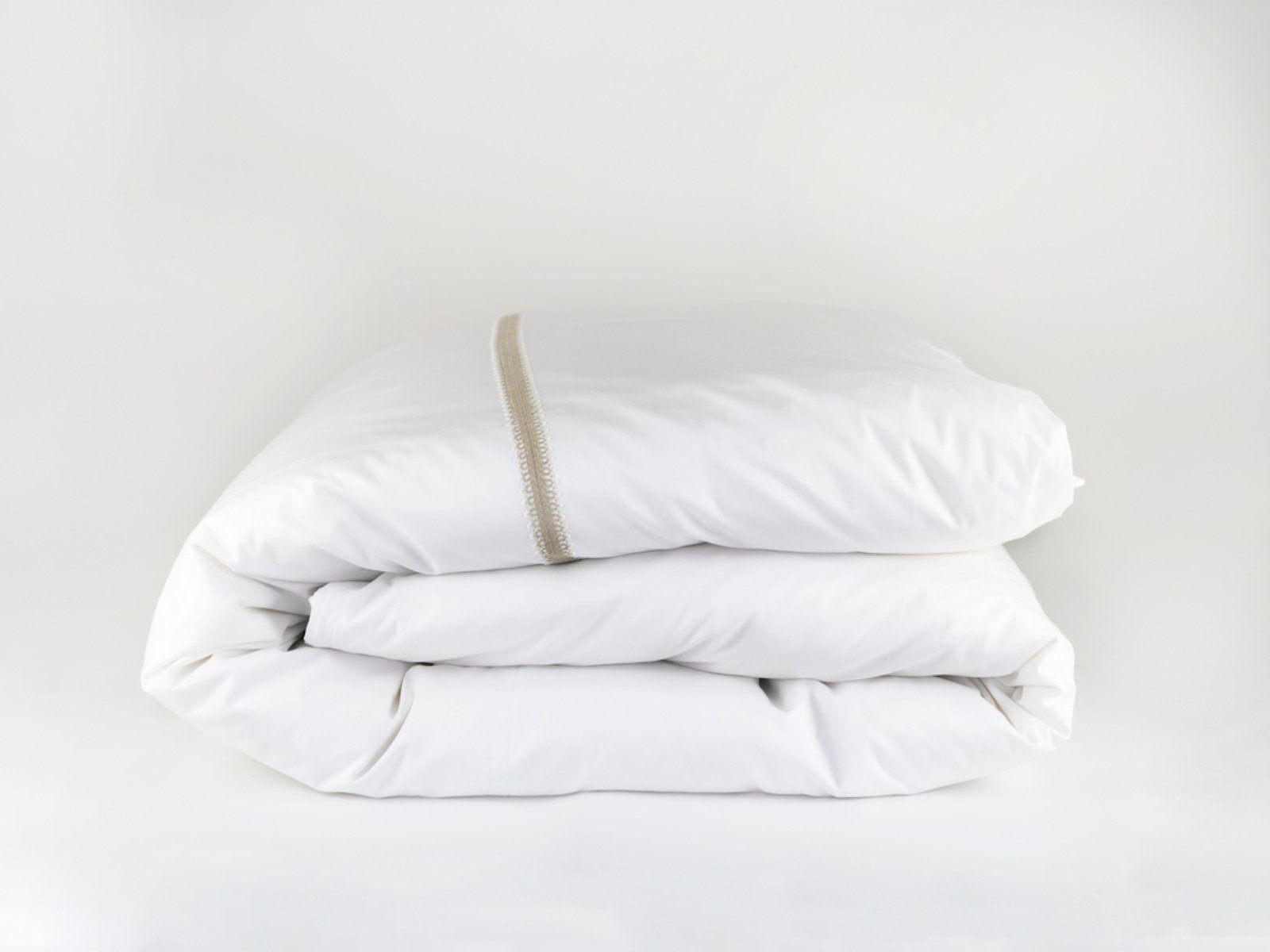 Наволочки классические, отделанные ШИРОКИМ КРУЖЕВОМ (на запахе), пододеяльник на потайной молнии, отделанный ШИРОКИМ КРУЖЕВОМ. Цвет основной ткани: белый; цвет кружева: бежевый.
